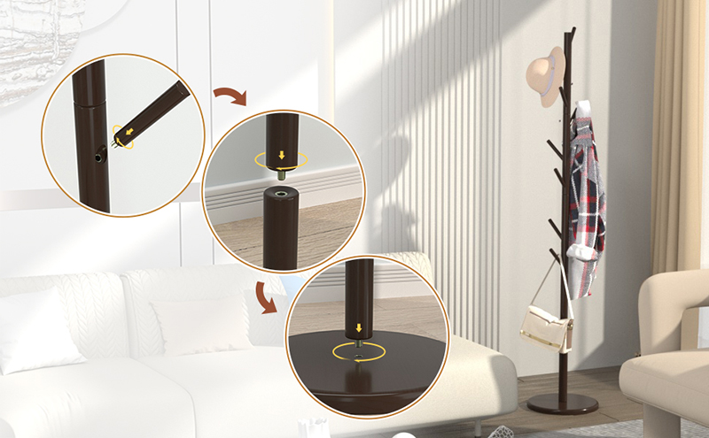 لا توجد حاجة لأي أدوات، رف المعطف مع الرف مجهز بالفعل بفتحات براغي معدنية، اتبع التعليمات وشدها في غضون دقائق، وسوف تحصل على رف معطف شجرة القاعة الثابت.