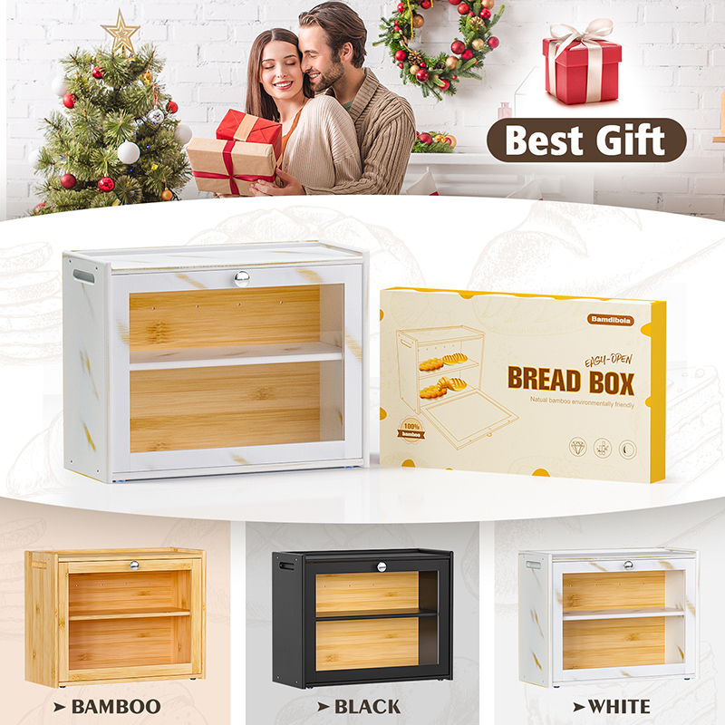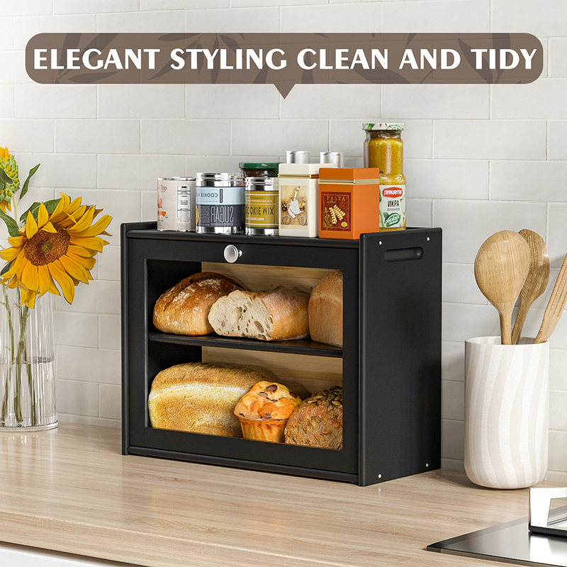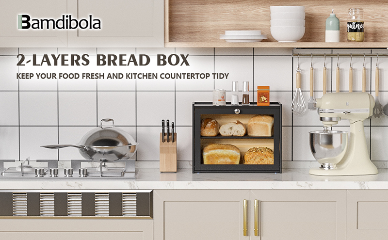 A double-layer bread box can hold 2 large loaves of bread, rolls, muffins, and more, making full use of inside space, the removable layer can be used as a cutting board, and the top can be a shelf, each part of our bread box is used effectively to make your home tidy.