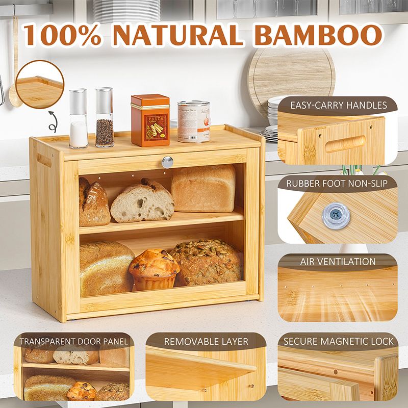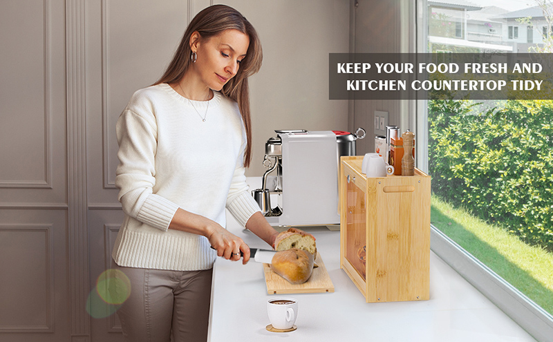 Made of premium and strong bamboo material, ecologically well disposed, moderate appeal to your kitchen, two handles on both sides make it easy-carry to different places, rubber foot non-slip on the bottom, avoid moving slip, making bread box more stable and safer.