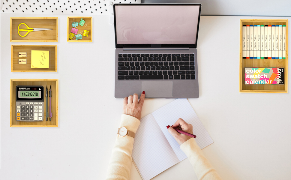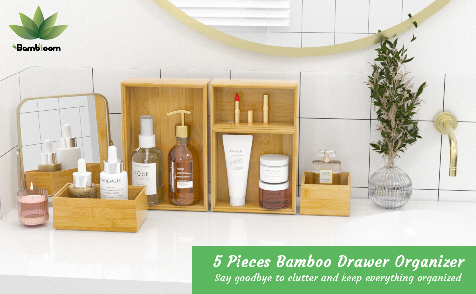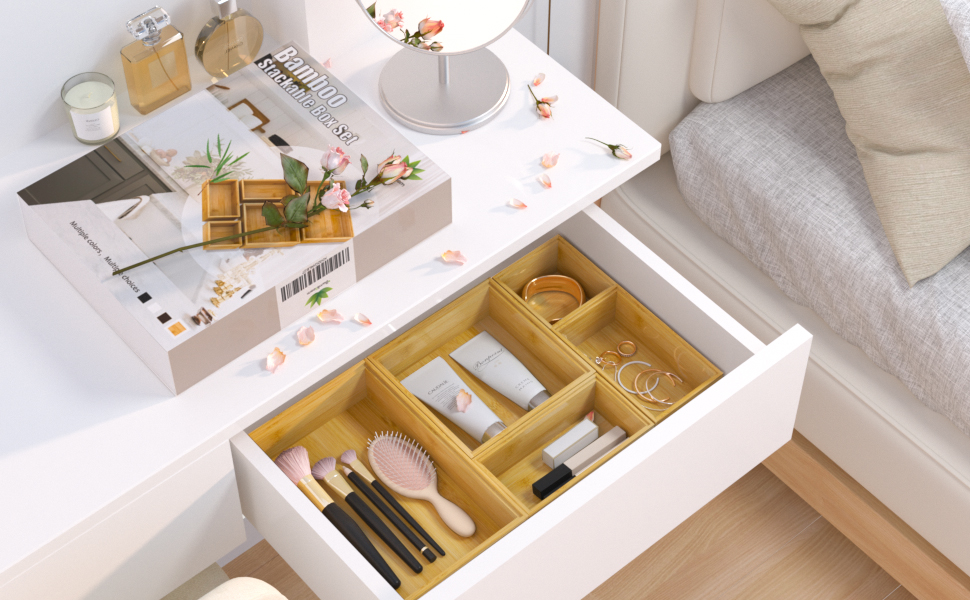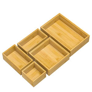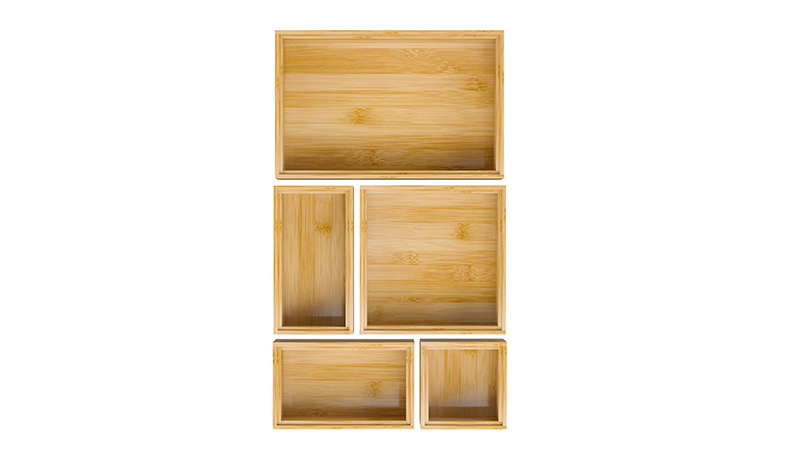 竹製引き出しオーガナイザー セットには 5 つのサイズ (cm) が含まれています。26.6×17×6.2cm、 17.6×17.6×6.2cm、 16.6×10×6.2cm、 17.6倍 9.1倍 6.2cm、 10×10× 6.2cm。