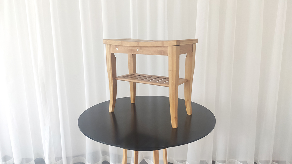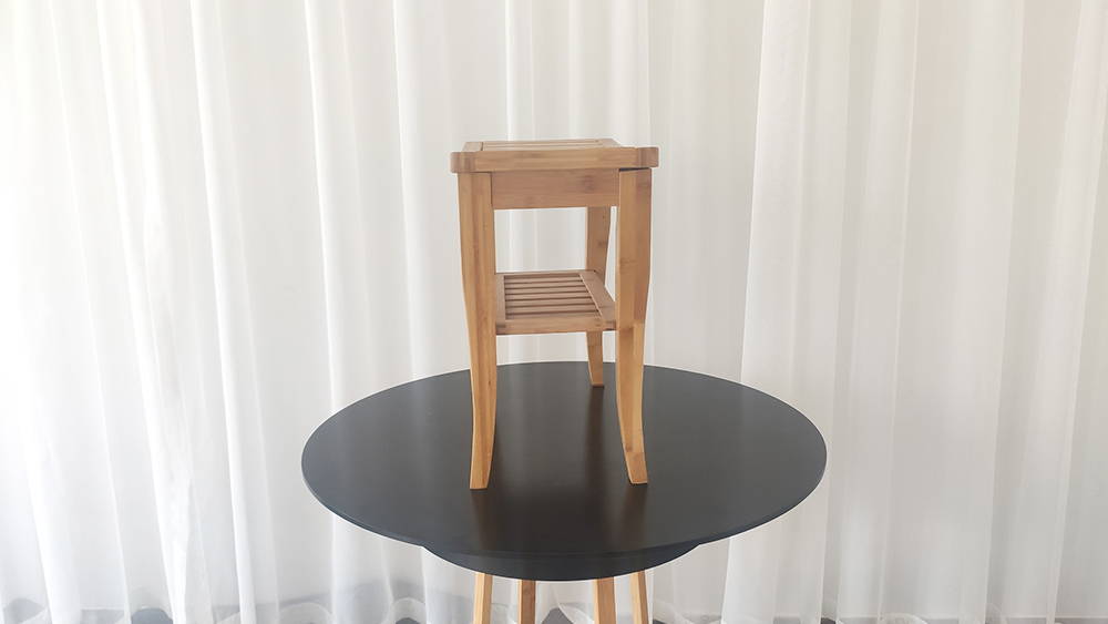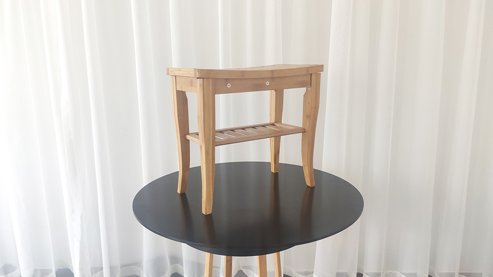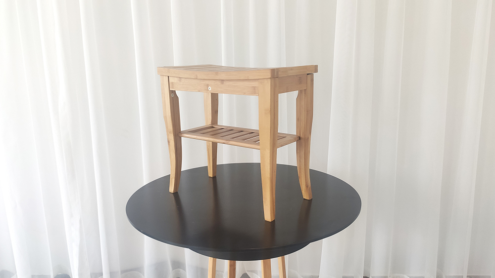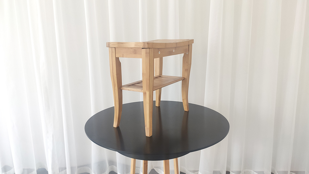 Nicely Made Stool with Thick and Stiff 100% Mountain Bamboos as Raw Material. Strong Enough to Hold More Than 150 Pounds Weight. The Second Shelf Makes It Firm and Holds Your Shoes or Other Stuff at the Same Time.