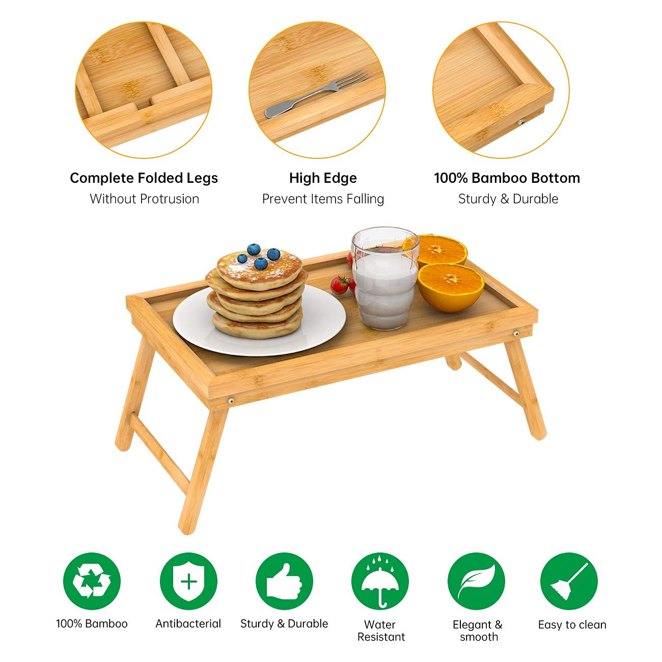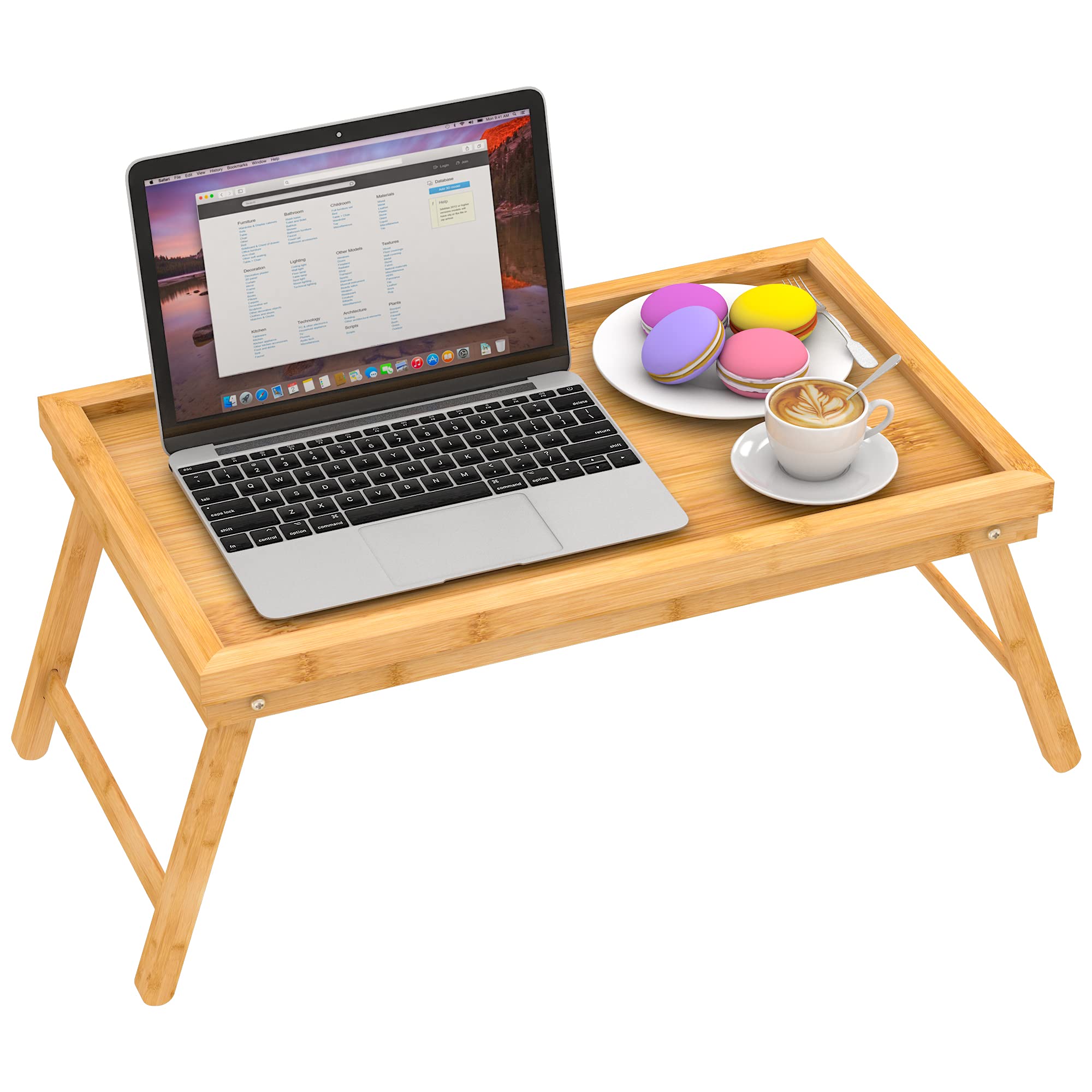 Bed breakfast tray with smooth surface and folding legs, perfect for breakfast in bed, snacks on the couch, desktop space for book and iPad, and elegant tray for hosting.