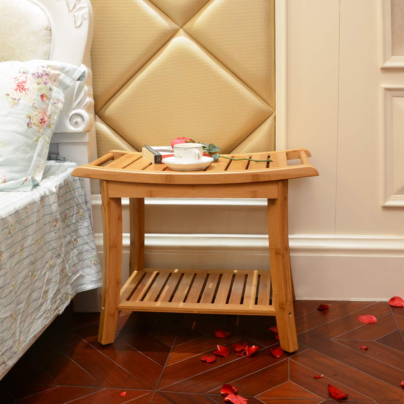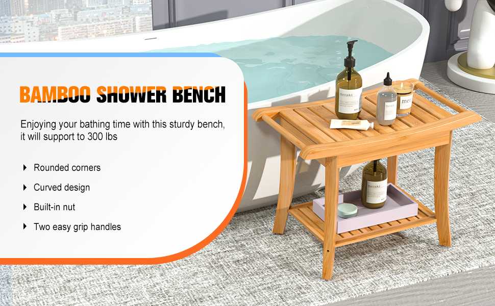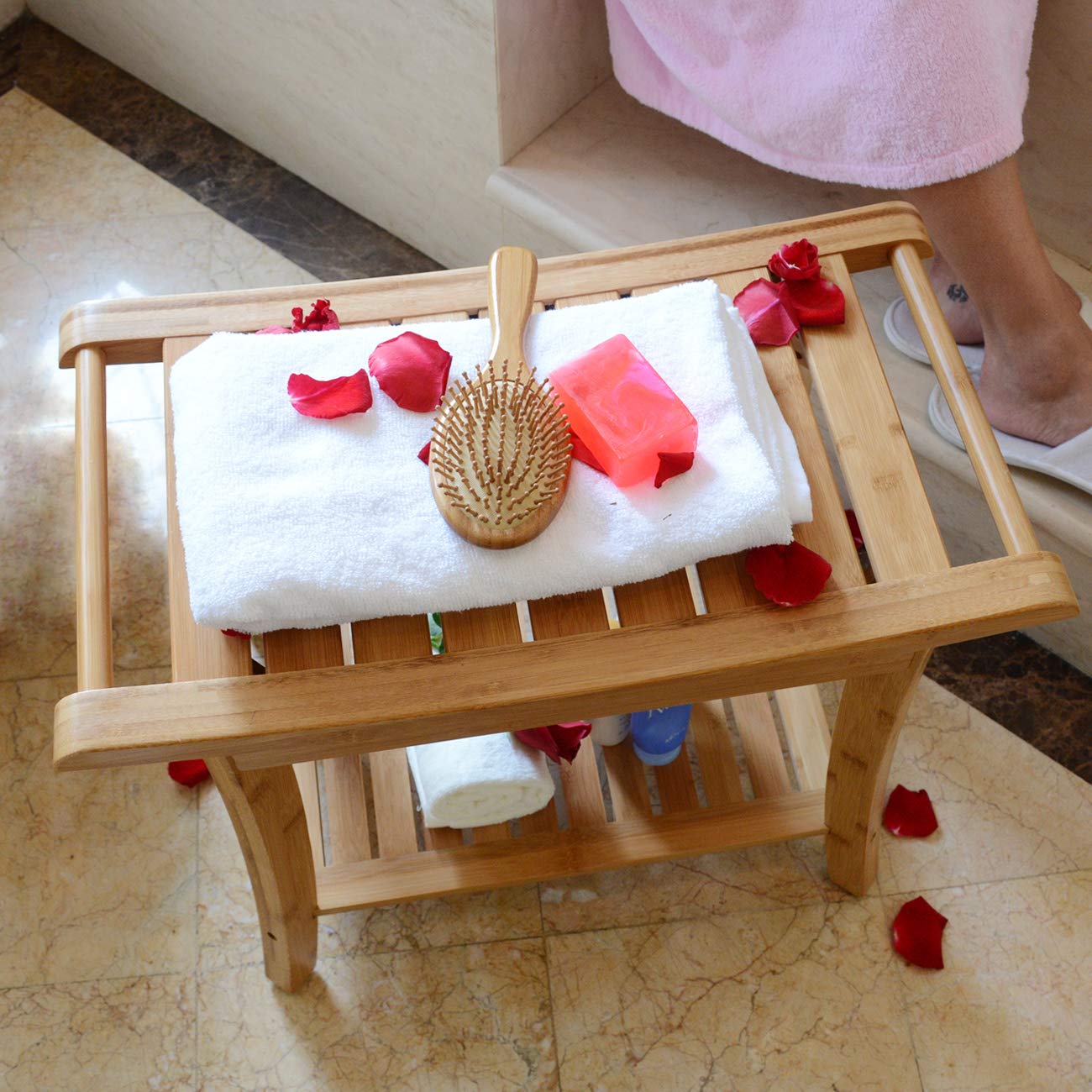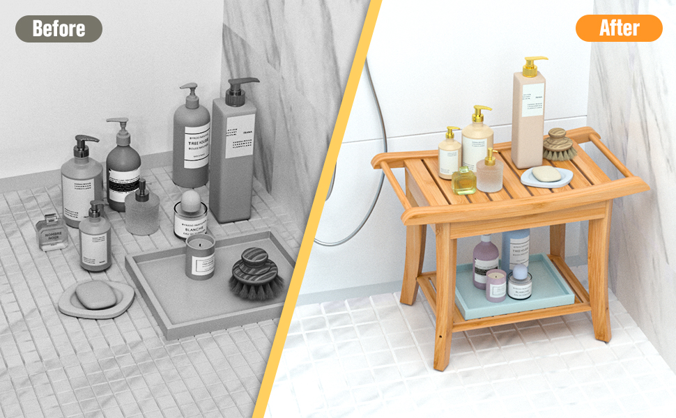 VERSATILITY AND PRACTICALITY: Our bath stool with a 2-tier storage shelf and two handles, can hold various bath items and hanging bathing towels. the smooth and curved top provides a comfortable seat for showering or shaving legs. It can be used as a stool or table in any room if you need it.