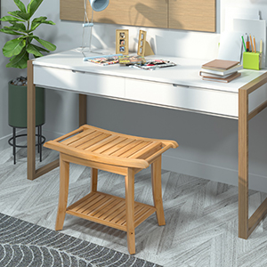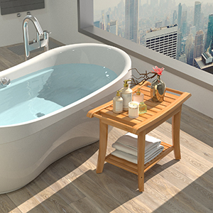 STURDY & STABLE: Our bath bench is made in the highest quality solid bamboo material, the slightly curved legs, and rubber pads make the seat more stable and safe. A great alternative to expensive teak wood stools, it will support up to 300 lbs.
