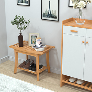 Our shower bath bench with a 2-tier storage shelf is the perfect addition to your bathroom or bedroom. With a smooth curving surface and legs, makes shaving and bathing safer and more comfortable. The rubber foot pads also provide a non-slip stable surface for extra stability. A fashionable & comfortable appearance is suitable for any room.