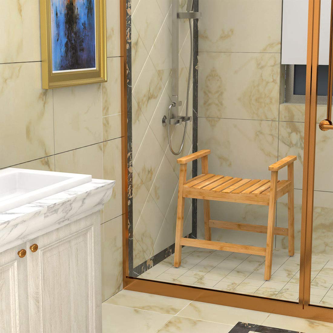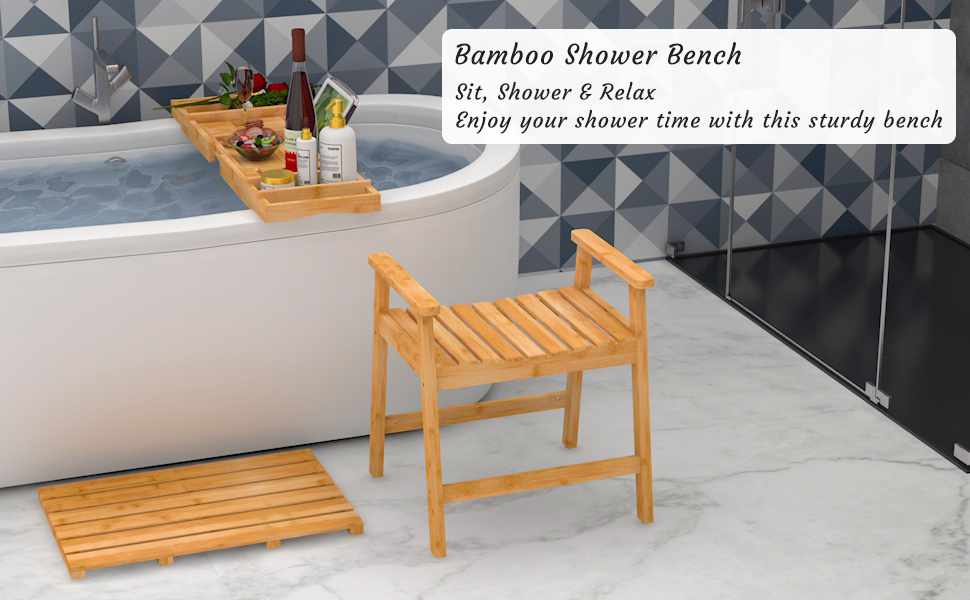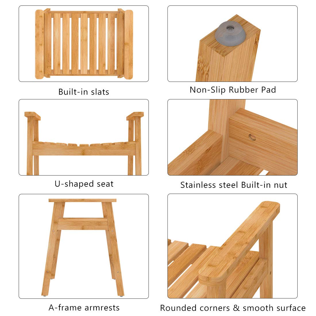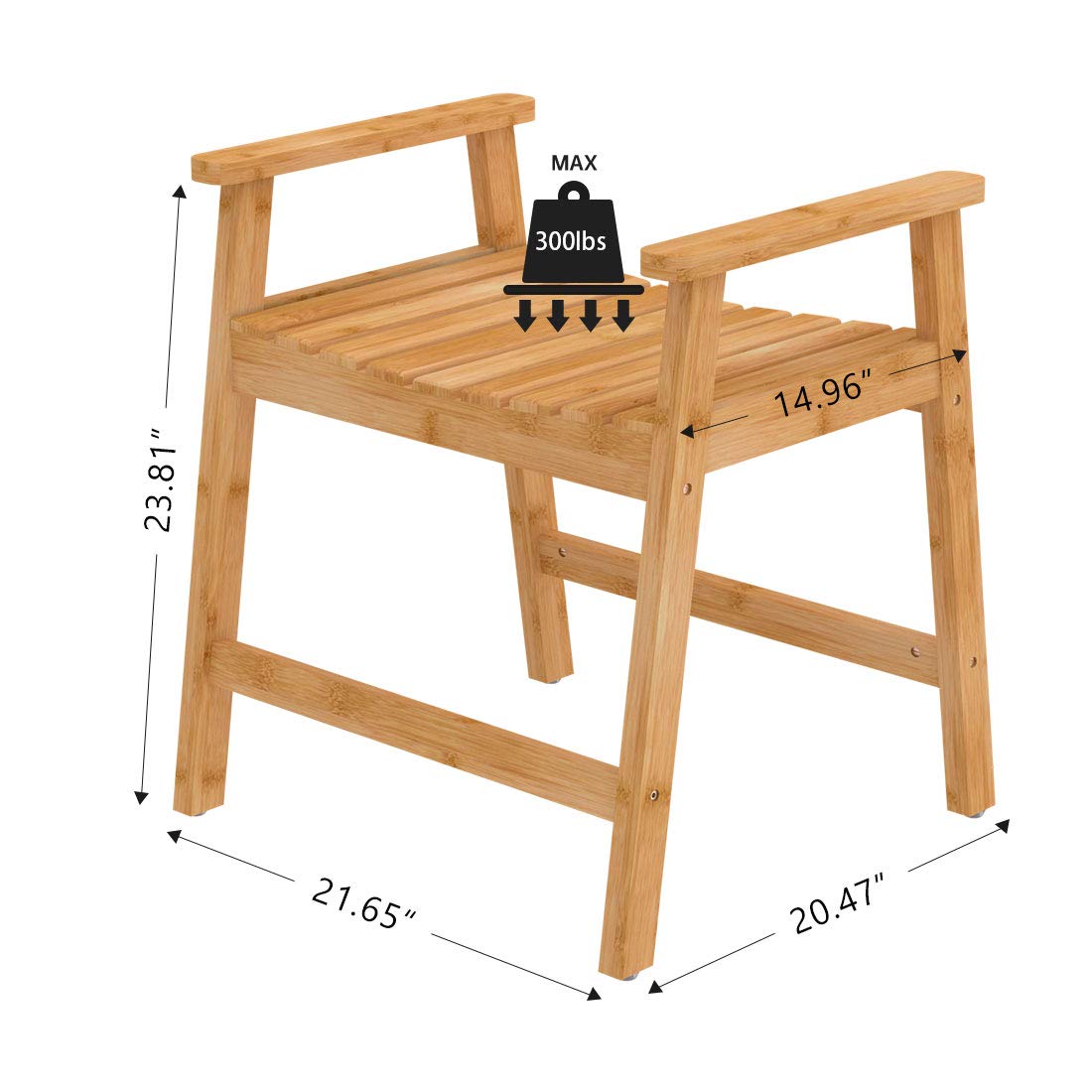 The bamboo shower chair is made of solid natural bamboo, the A-frame design and the non-slip rubber pads make the shower seat more stable and safer. it will support up to 300 lbs.
