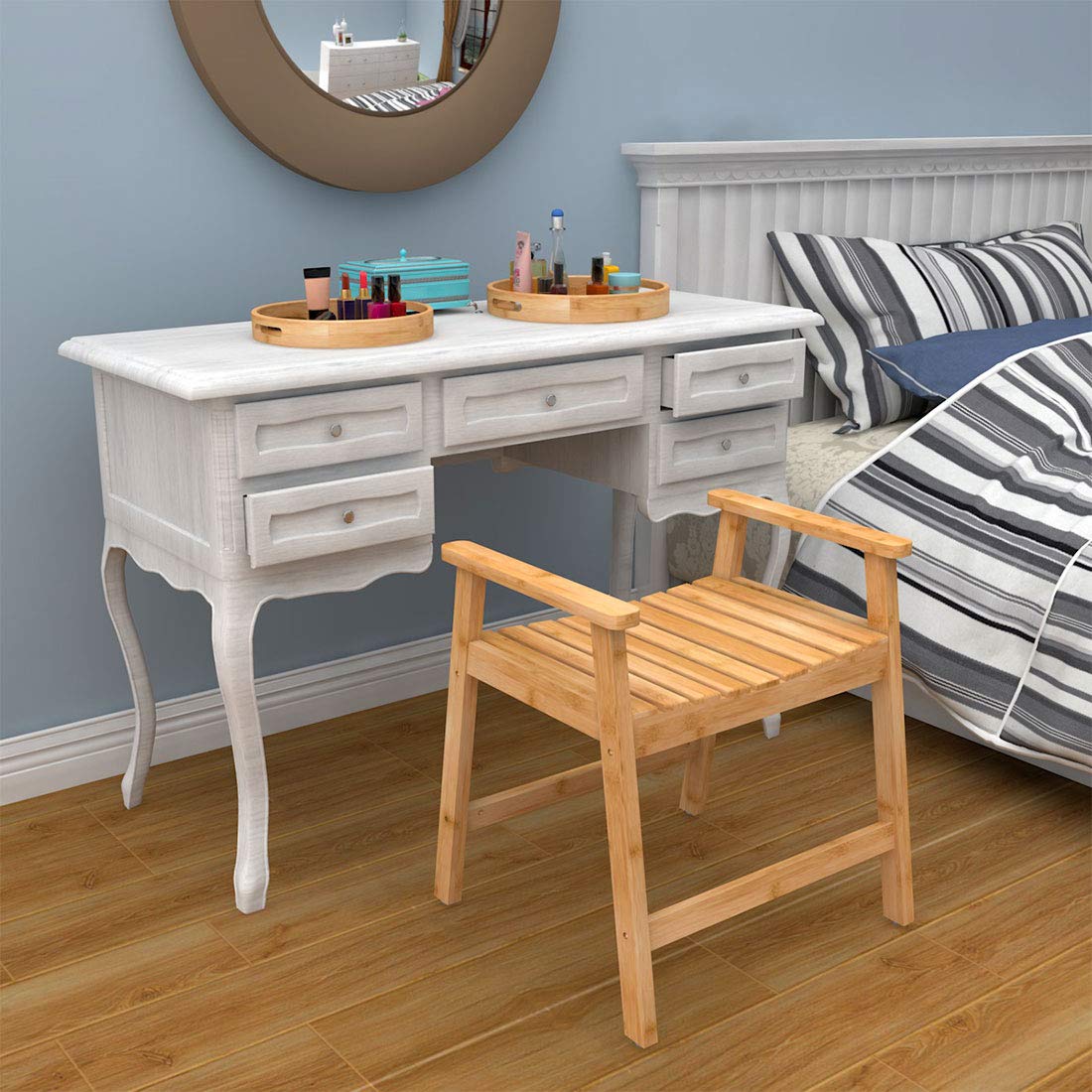 Our shower chair can be placed inside your bathroom. You can safely sit while you wash your body and shave your legs. This shower seat for adults has a 300lbs capacity. This bath chair shower seat with arms assembled in just minutes with no tools required. The arms offer additional comfort and also reduce slipping. With a strongly constructed frame with angled legs and nonskid rubber feet, this shower chair with rails is both sturdy and durable. Its wide seat offers good support for individuals during use. the gap between the slats is designed to allow water to be drained effectively which helps in reducing the risk of slipping. It offers a comfortable and safe solution to any fall-risk individuals, seniors, and elderly who have problems standing while showering.