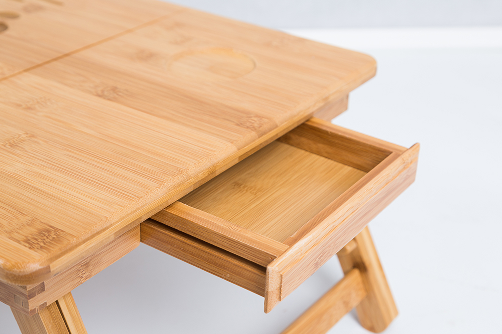 Worry-saving Cup-Groove. Small drawer with Built-in Magnet for storing pen, notepad, or phone without worry of the drawer rolling out. A stopper prevents your laptop from slipping from the desktop. Foldable and extended legs for easy storage.