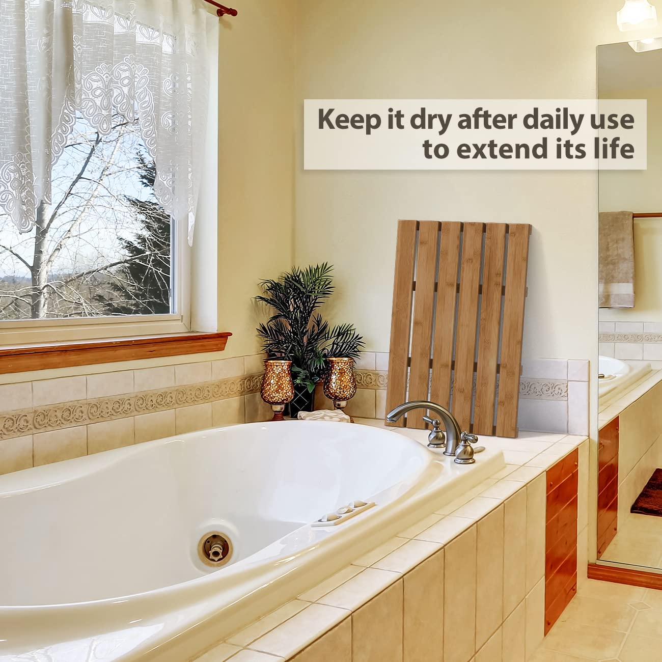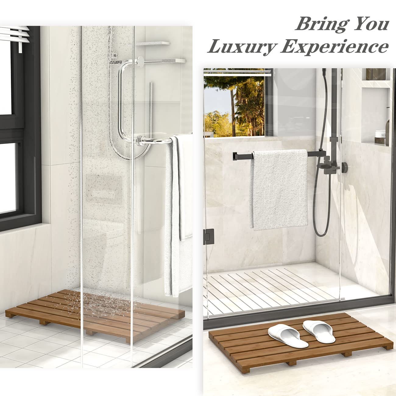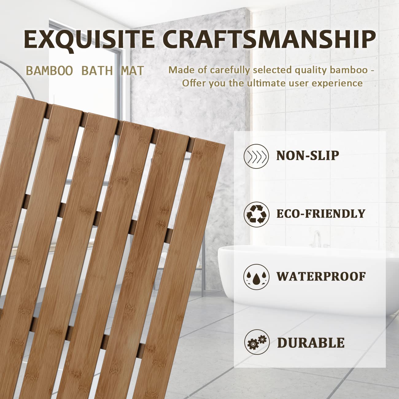 PREMIUM MATERIAL: We only choose superior bamboo to make our wooden bath mat; bamboo is an eco-friendly plant, it has the characteristics of renewability and shorter growing duration which are accordant with the environmental protection concepts but also durable & sturdy.