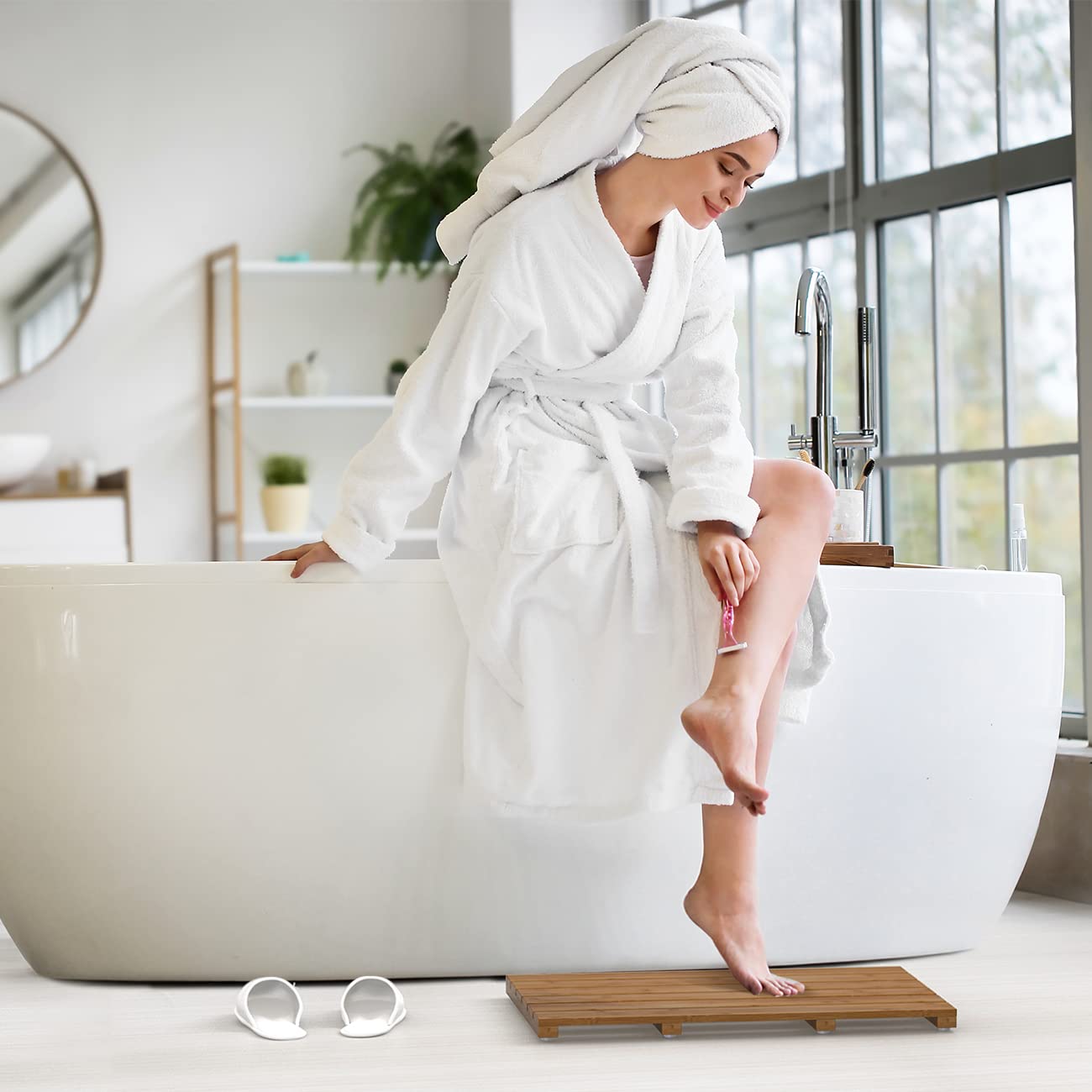 VERSATILE: This bamboo bath mat not only has a simple appearance but is also practical and versatile; it can fit both indoors and outdoors such in the bathroom, bedroom, living room, kitchen, office, sauna, front porch, balcony, poolside, backyard... - make the best use of it at will