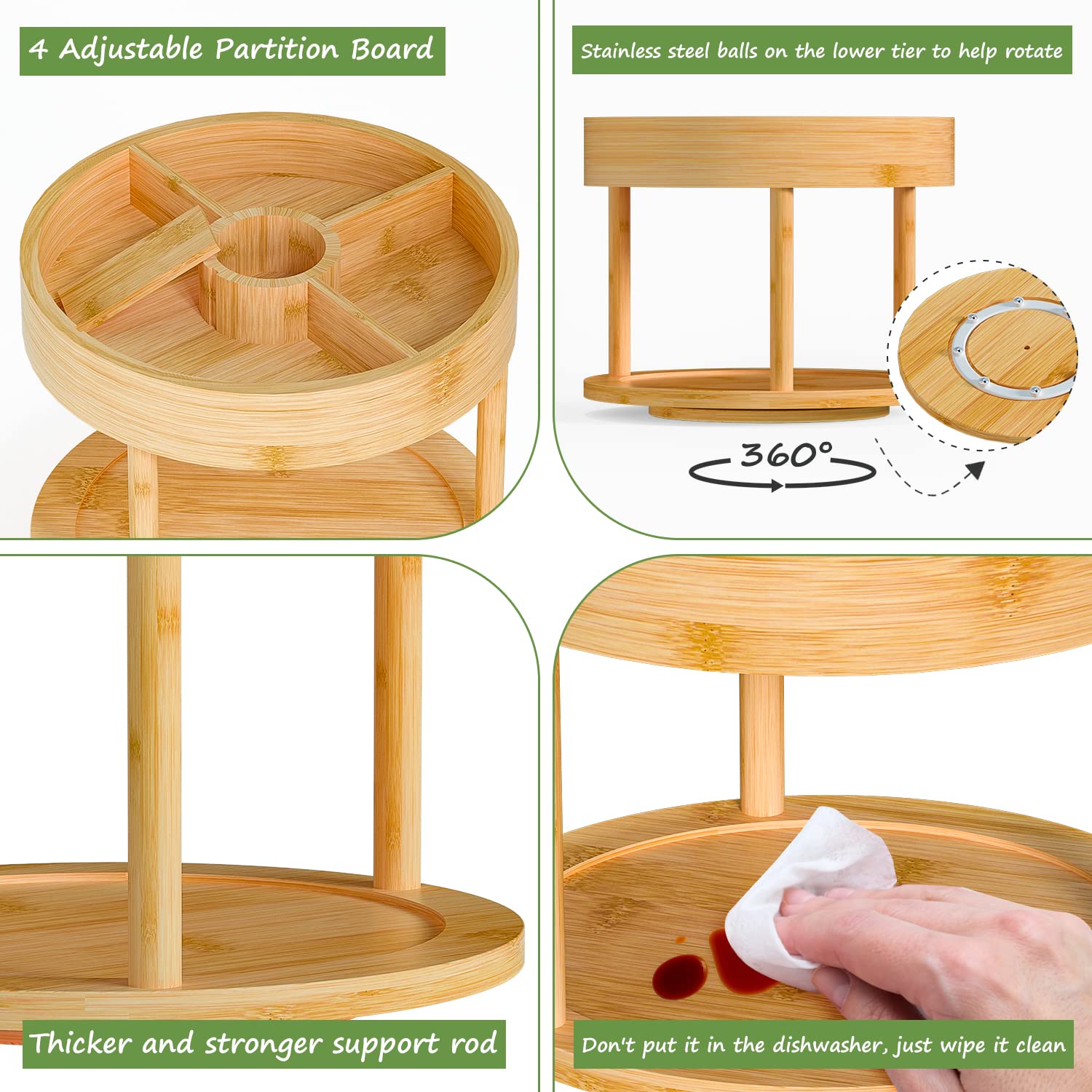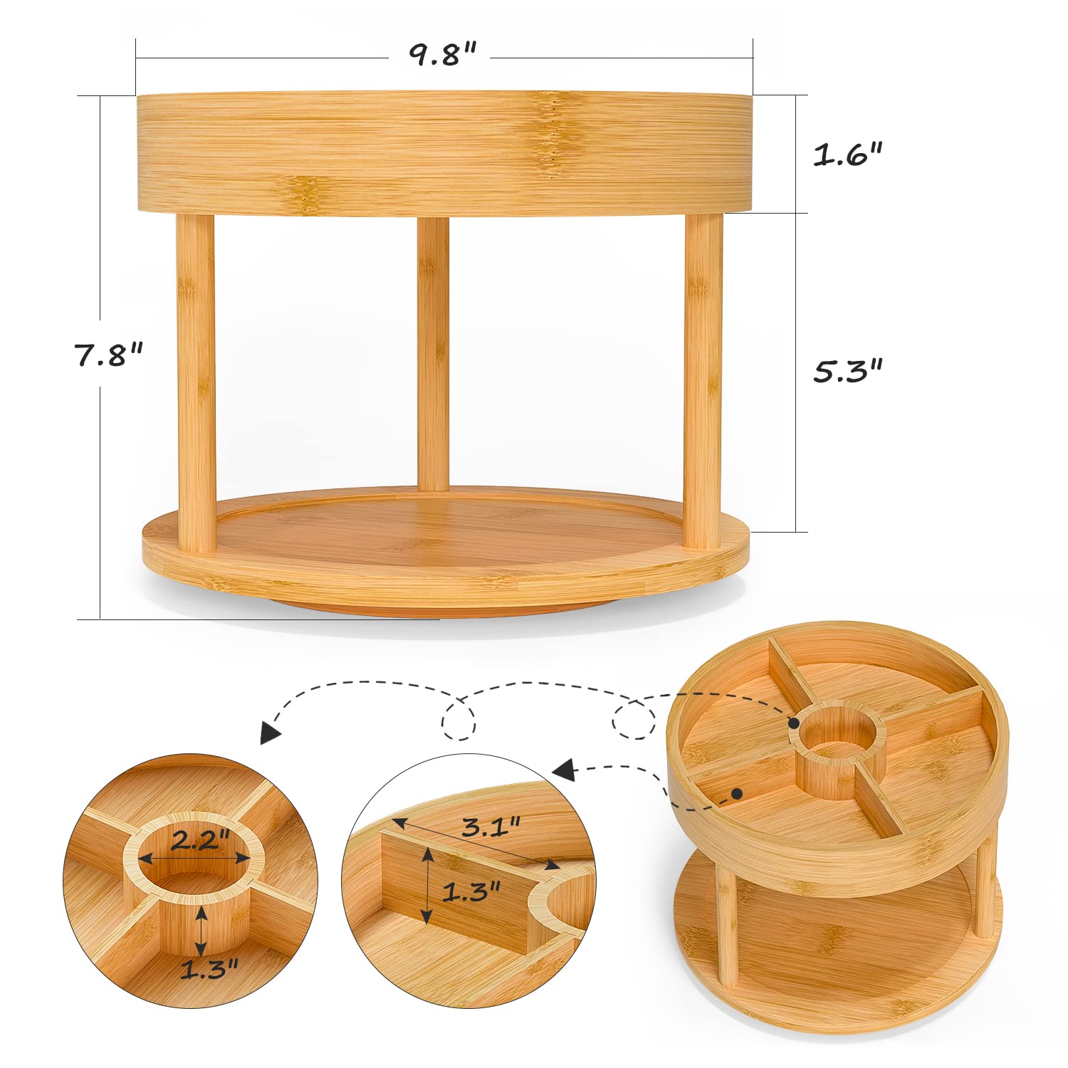 Bamboo Wooden Spice Organizer - Two Tier Lazy Susan Turntable with 4 DIY Partition Board 9.8 inch for Cabinet