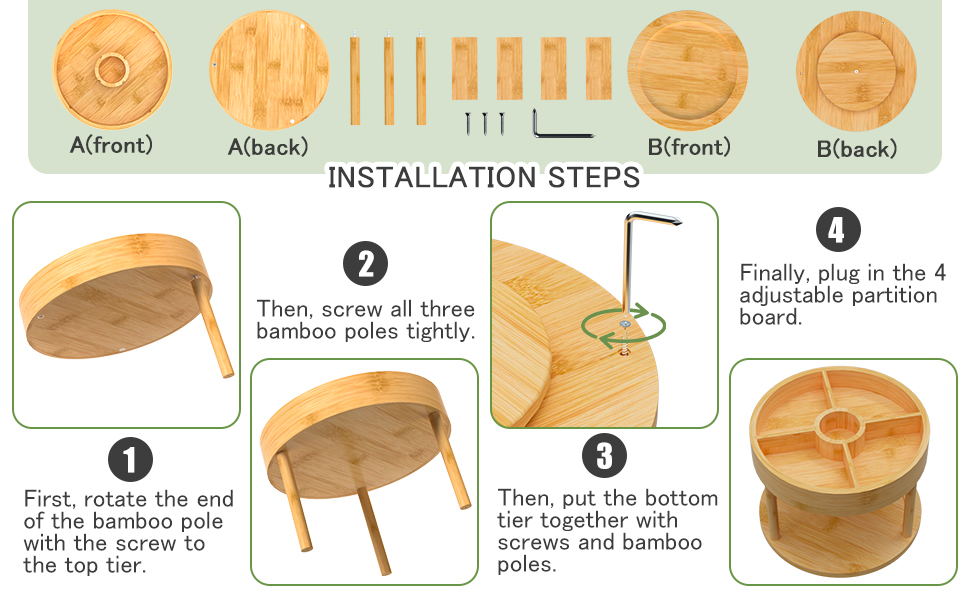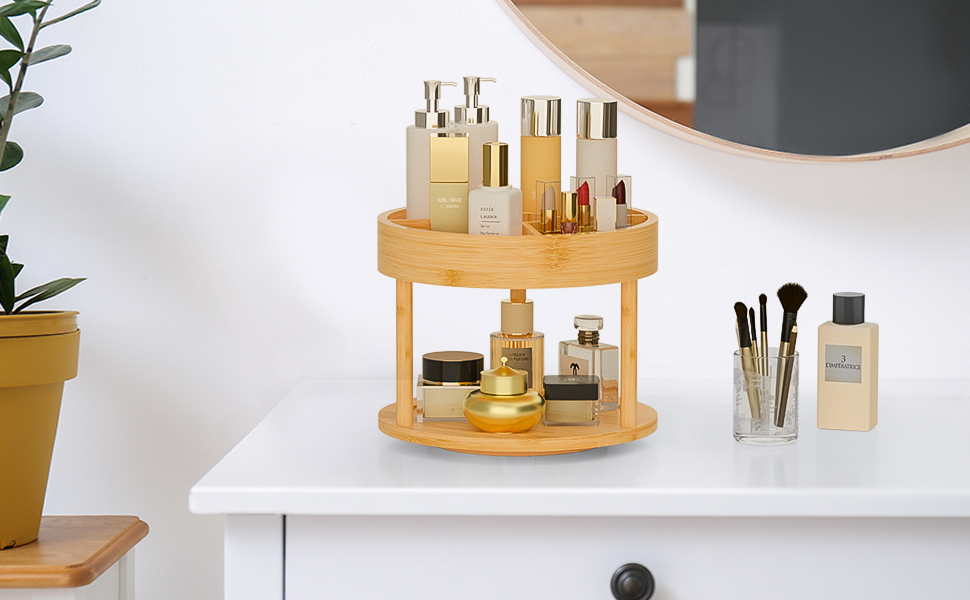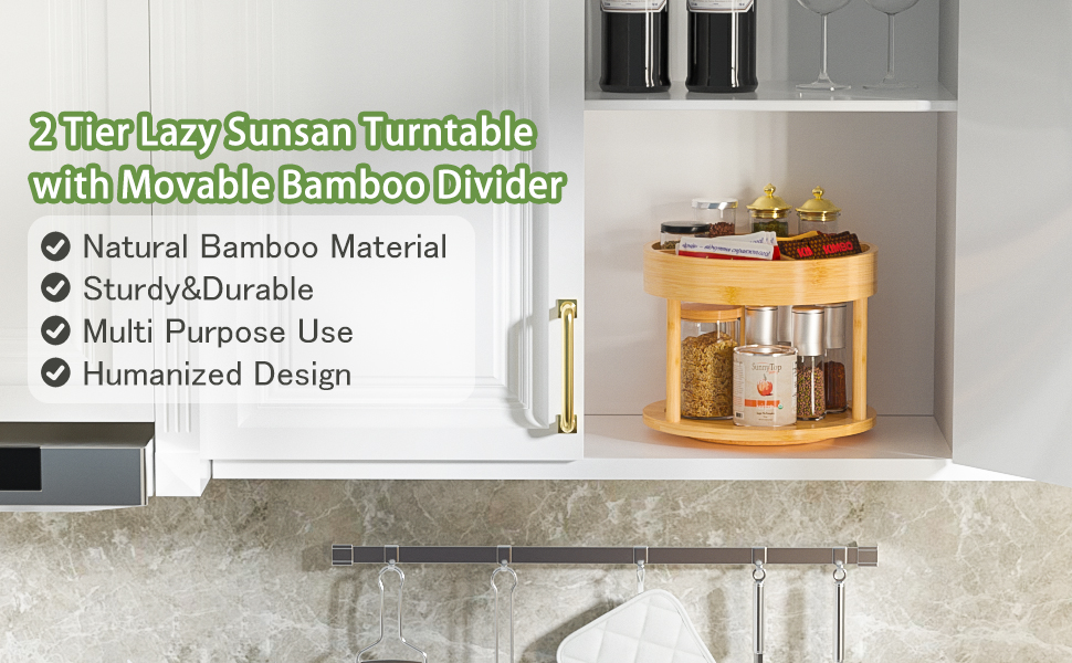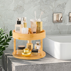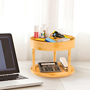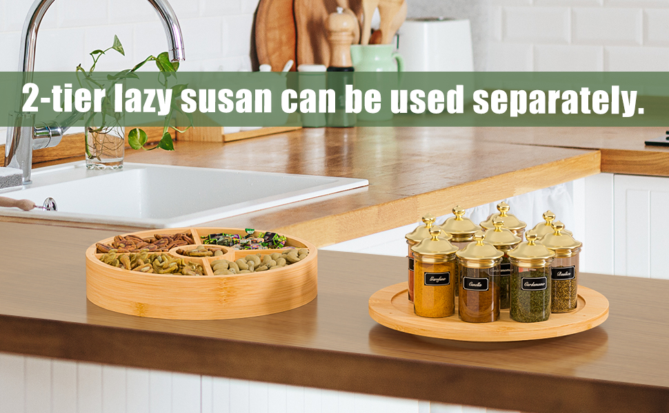 The bamboo two-tier Lazy Susan can be rotated 360 degrees, making it easy to store or take out items, which is perfect for small or narrow spaces.