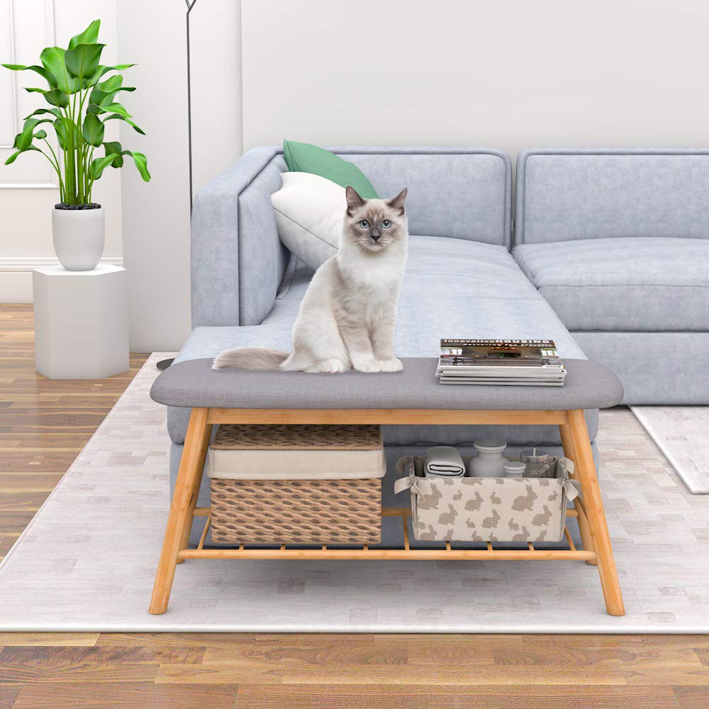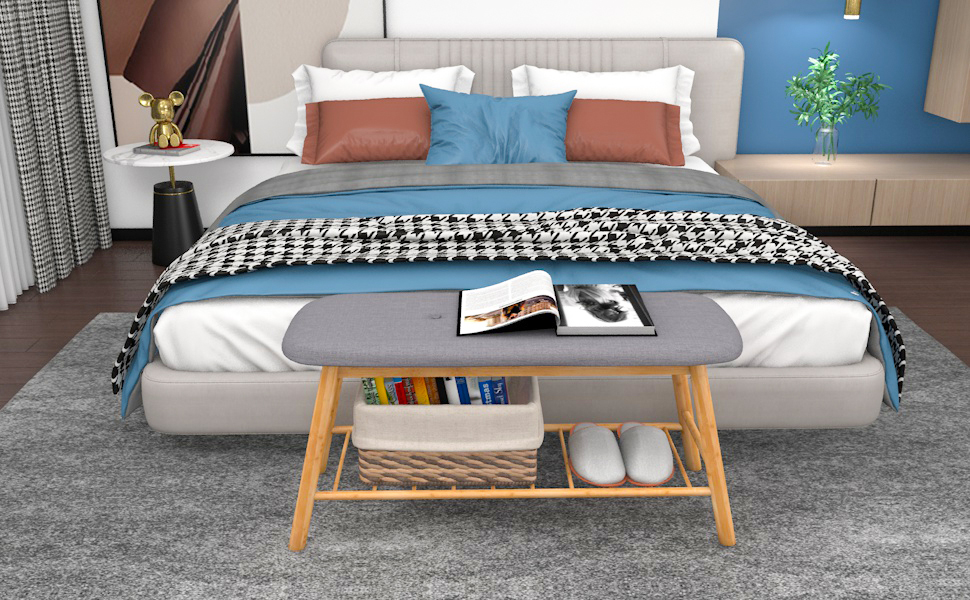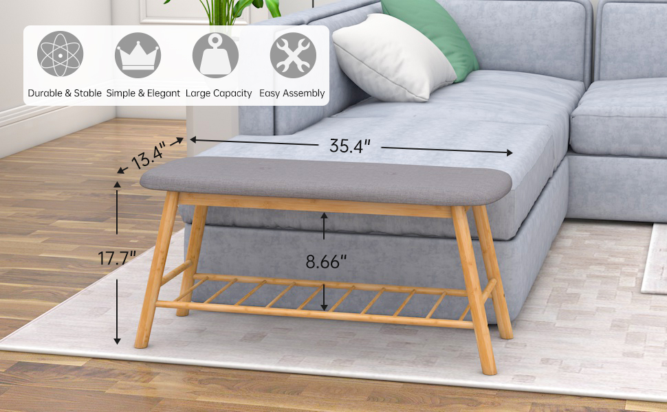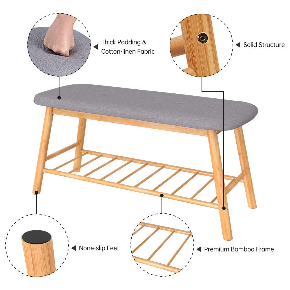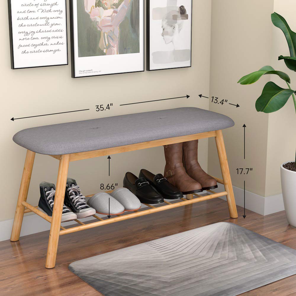 Shoe Bench Ottoman Upholstered, grey Padded Cushion, Bamboo Storage Seat Shelf, Free free-standing entryway, Hallway, Bedroom, and Living Room.