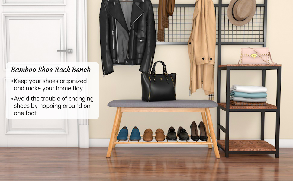This shoe bench has a solid frame that is further supported by four bamboo legs and a lower shoe rack, ensuring worry-free seating and storage.