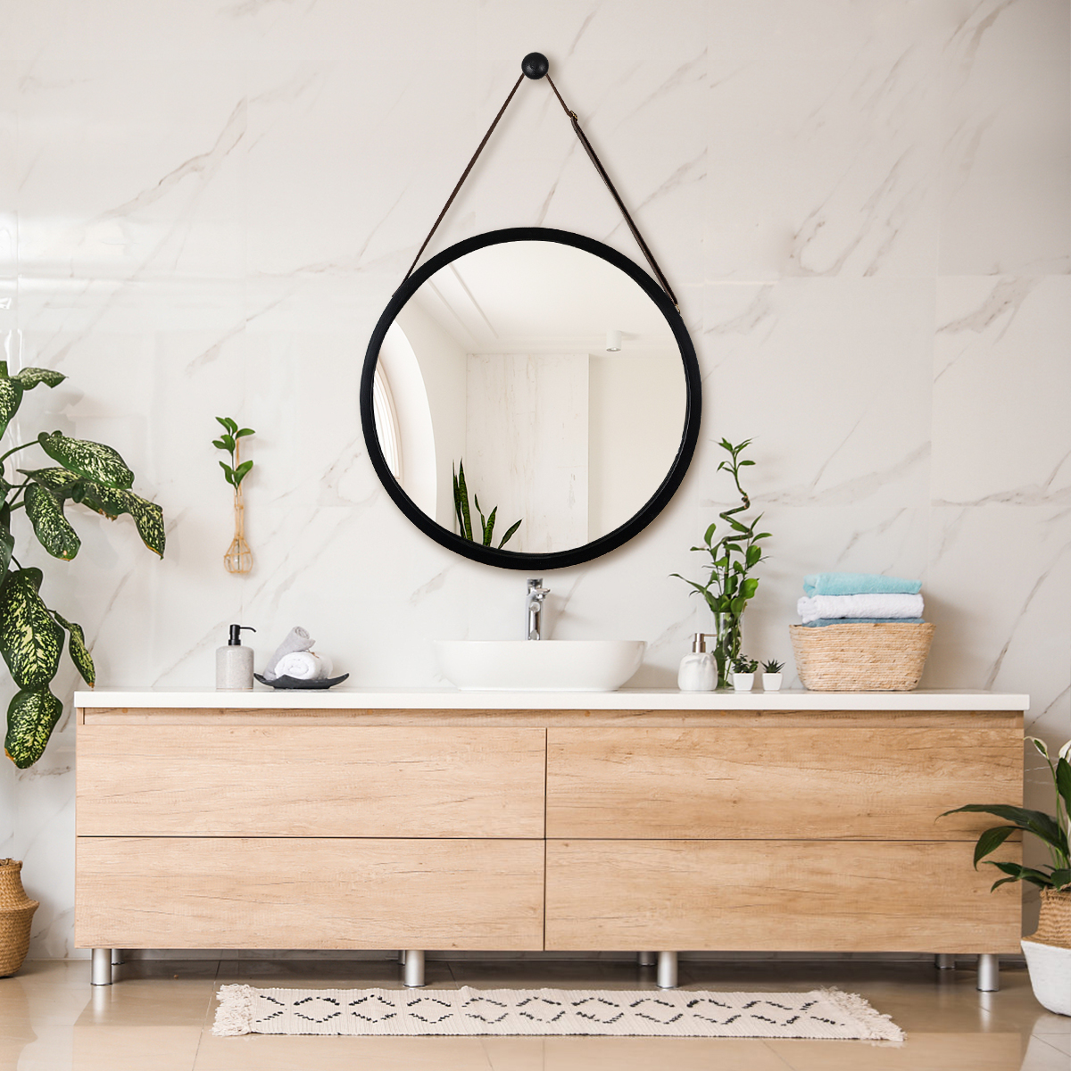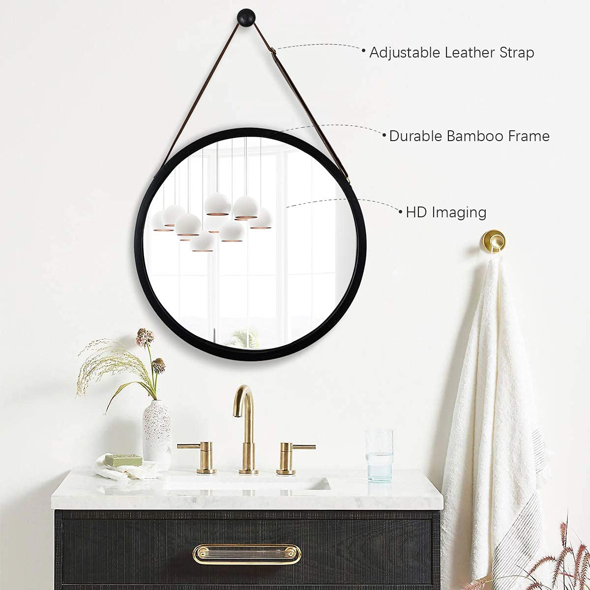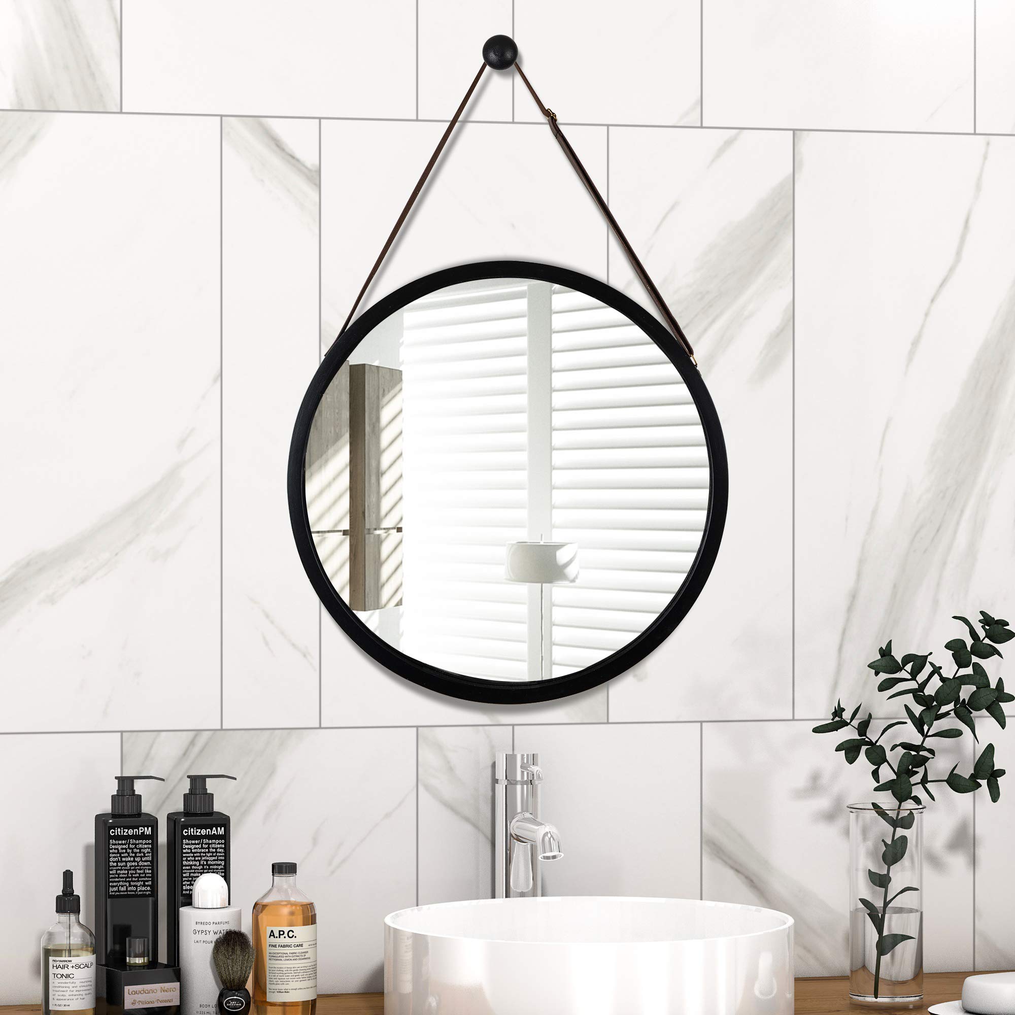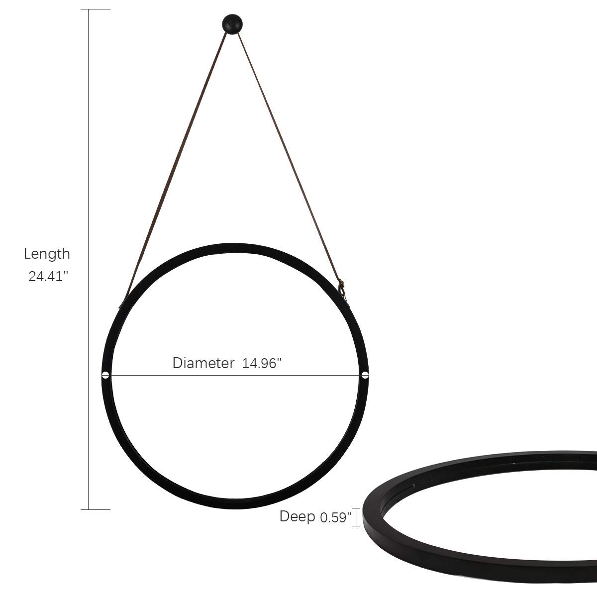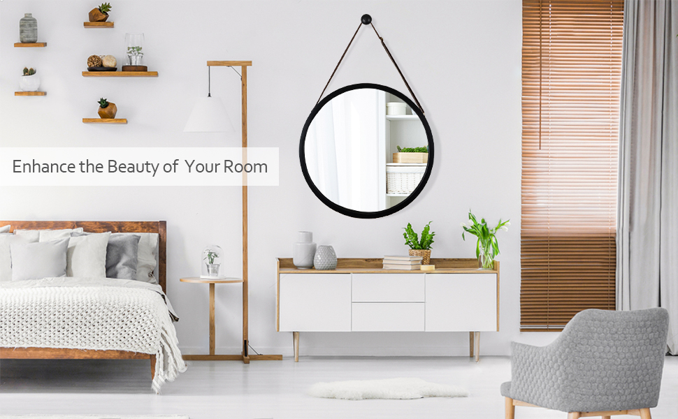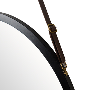 This hanging round mirror features a wall mount hook, allowing for easy installation. An adjustable PU leather strap allows for personalization and ease of use.