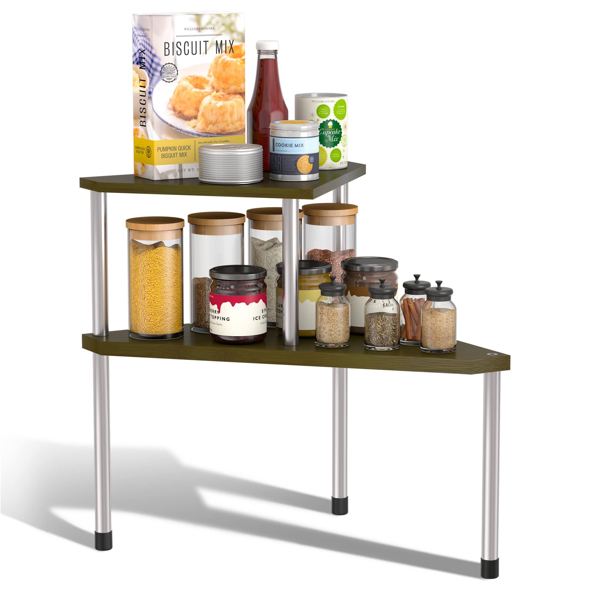 Made of bamboo and stainless steel, this kitchen countertop organizer is sturdy and durable. Rubber feet on the bottom prevent slipping.