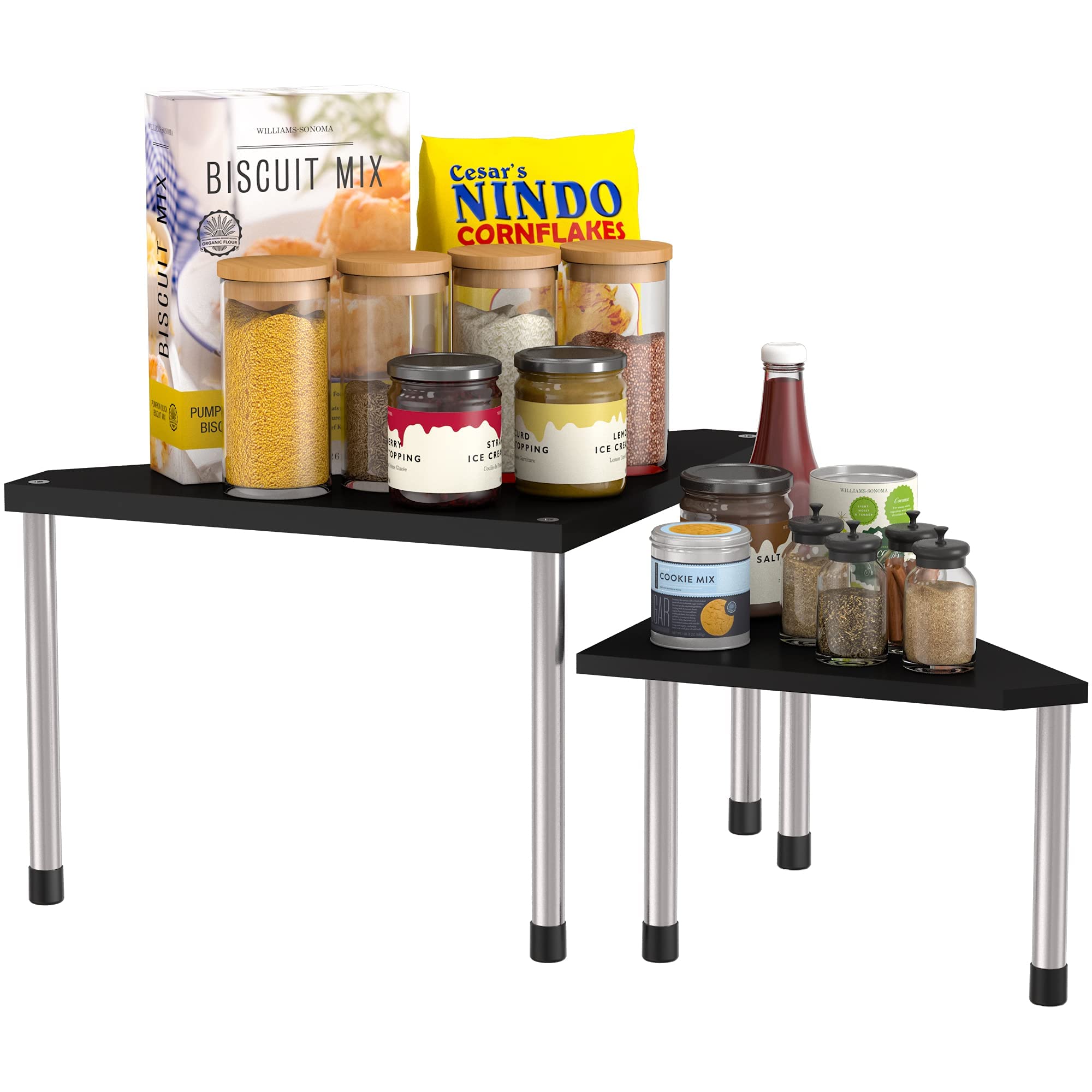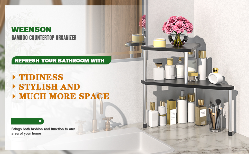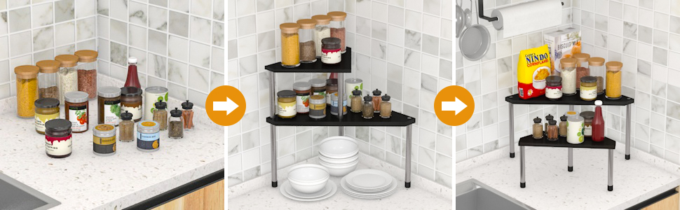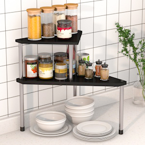 The Countertop Organizer is the perfect choice for kitchens, bathrooms, and dorm rooms. The flexible design allows it to be used as a single two-tiered organizer or separated into two triangle bathroom organizers.