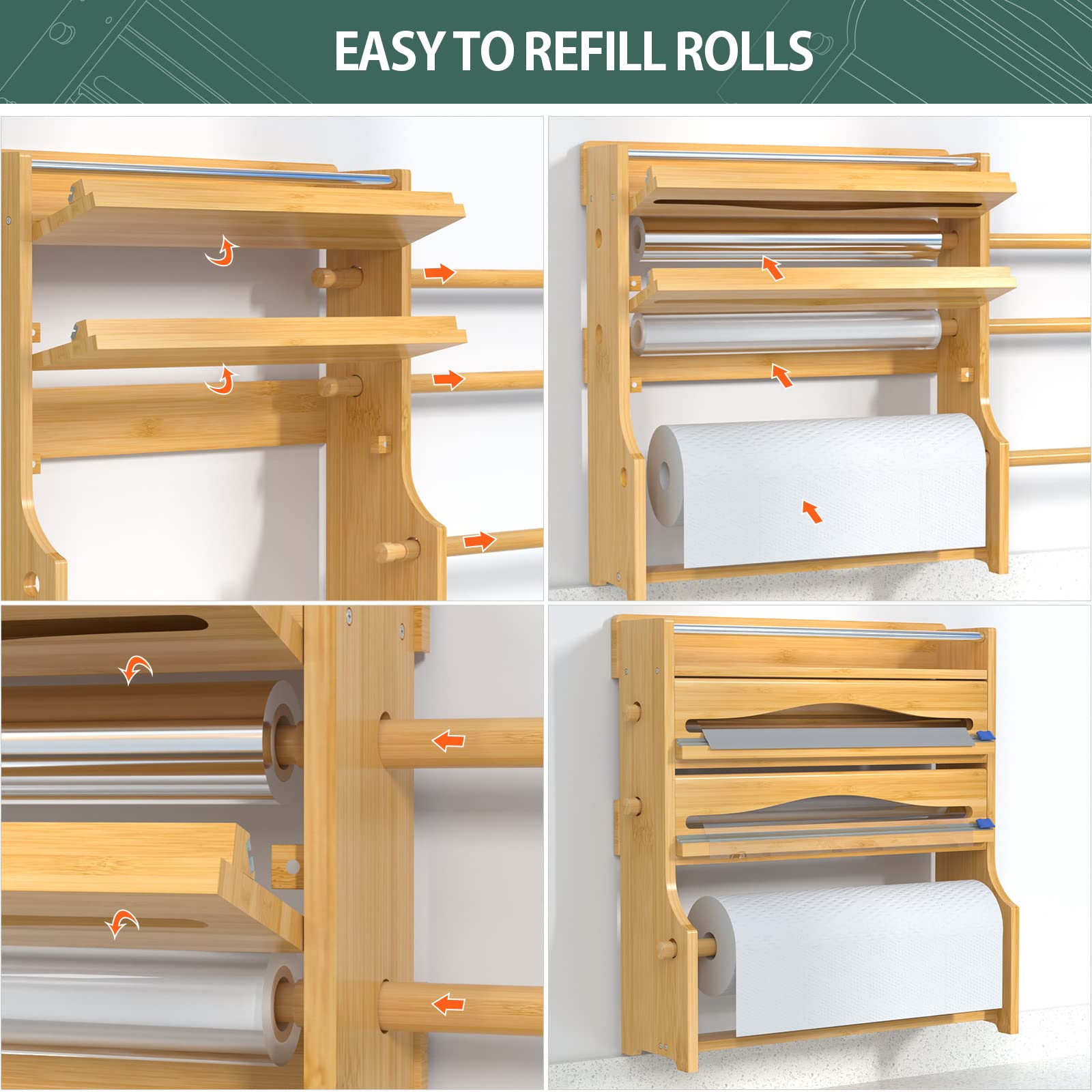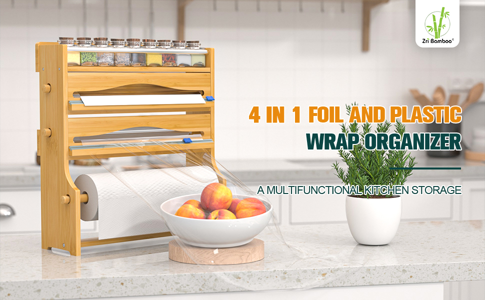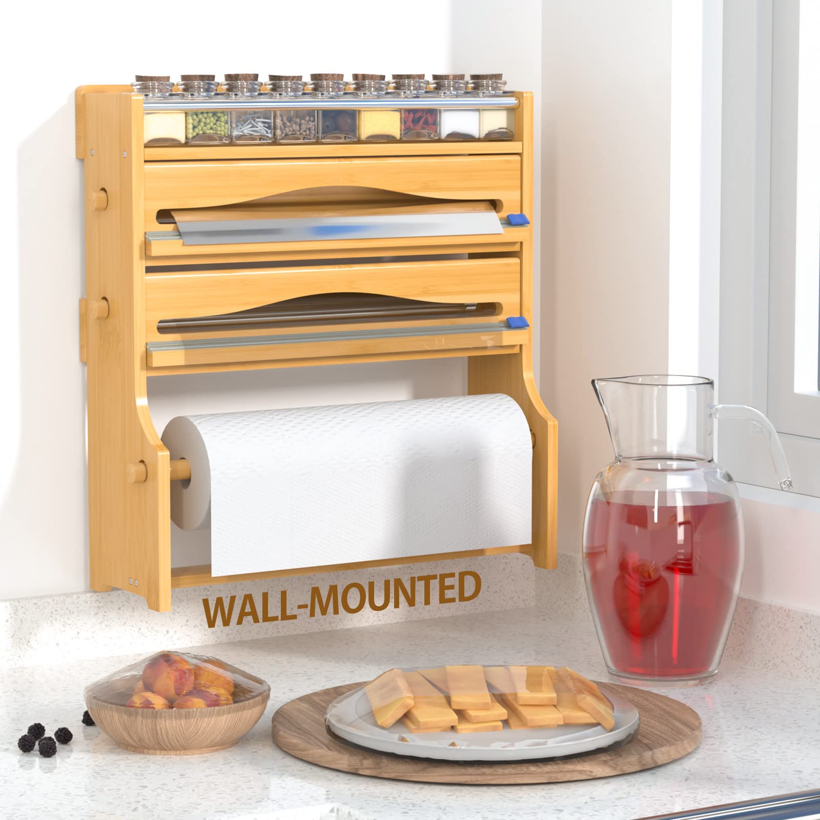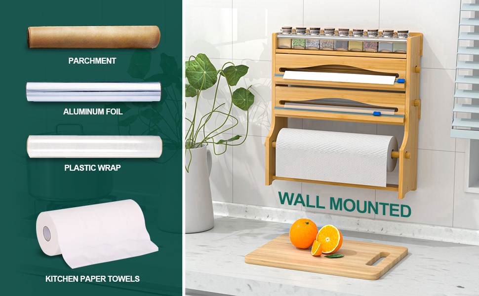 2 dispensers for parchment paper, wax paper, foil, and cling wrap,1 spice shelf, and 1 kitchen paper towel holder.